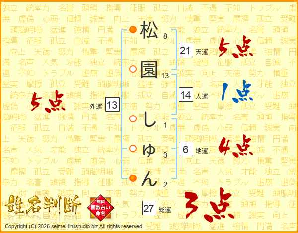 松(8画)園(13画) し(1画)ゅ(3画)ん(2画)