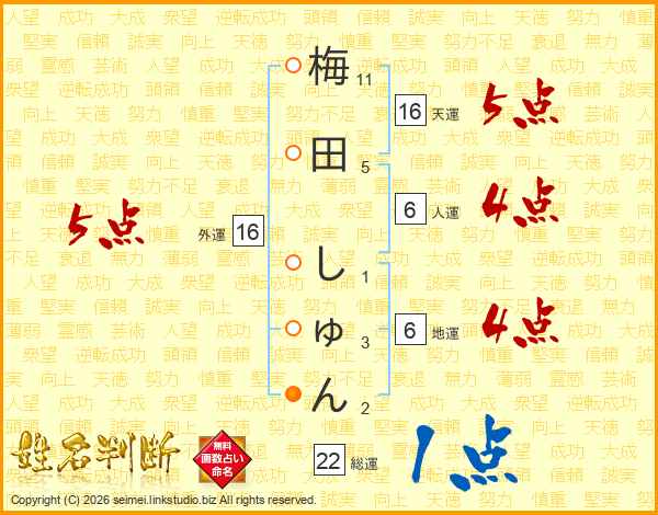 梅(11画)田(5画) し(1画)ゅ(3画)ん(2画)