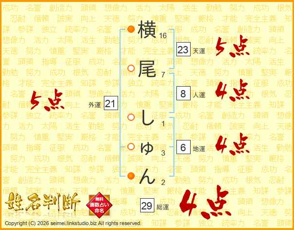 横尾しゅんさんの総運は29画の4点!
