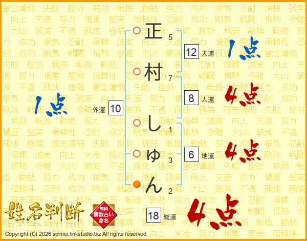 正(5画)村(7画) し(1画)ゅ(3画)ん(2画)
