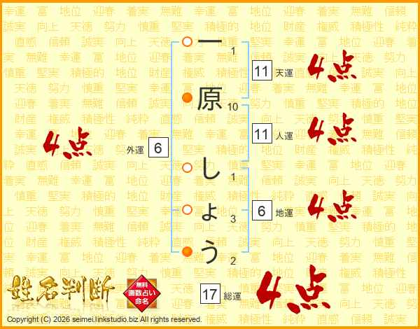 生活面を象徴する運勢です。外部から受ける影響力を表し、結婚運、家庭運や職場、環境への順応性を表します。総運から人運を引いた画数。姓や名が1文字の場合を除く。