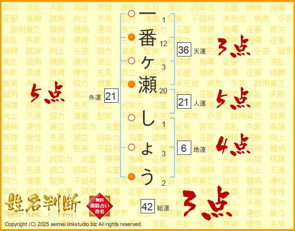 一番ヶ瀬しょうさんの総運は42画の3点!