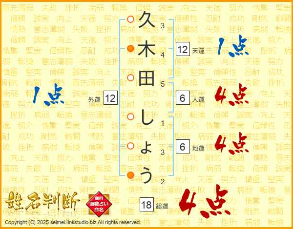 生活面を象徴する運勢です。外部から受ける影響力を表し、結婚運、家庭運や職場、環境への順応性を表します。総運から人運を引いた画数。姓や名が1文字の場合を除く。