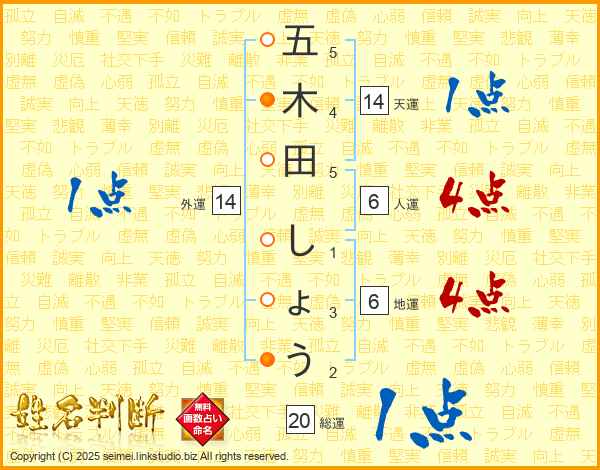 生活面を象徴する運勢です。外部から受ける影響力を表し、結婚運、家庭運や職場、環境への順応性を表します。総運から人運を引いた画数。姓や名が1文字の場合を除く。
