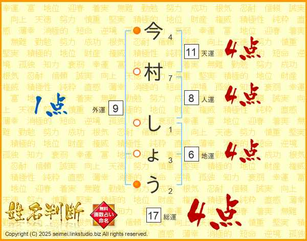 今(4画)村(7画) し(1画)ょ(3画)う(2画)