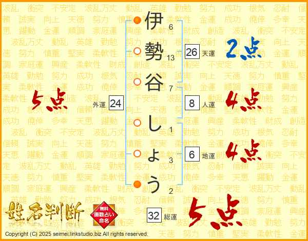 伊(6画)勢(13画)谷(7画) し(1画)ょ(3画)う(2画)