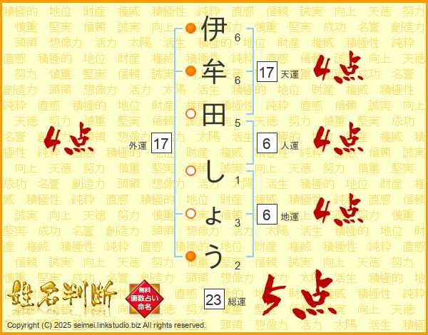 伊(6画)牟(6画)田(5画) し(1画)ょ(3画)う(2画)
