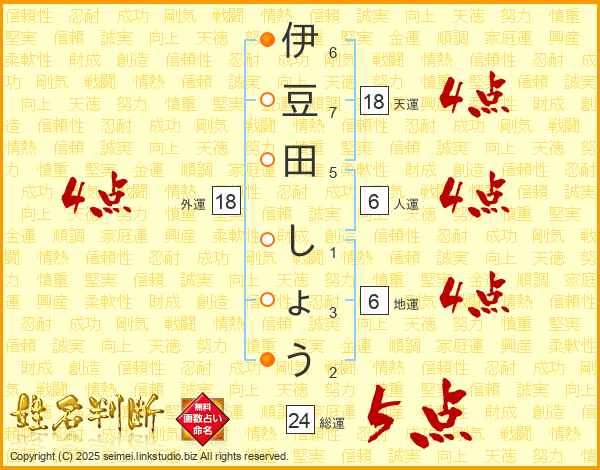 伊(6画)豆(7画)田(5画) し(1画)ょ(3画)う(2画)
