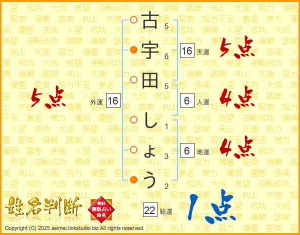 古(5画)宇(6画)田(5画) し(1画)ょ(3画)う(2画)