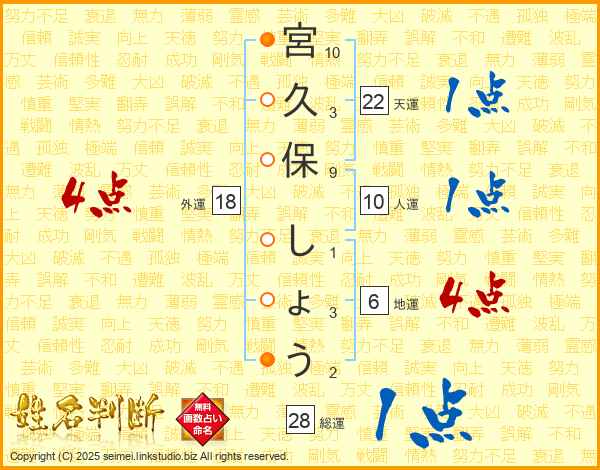 生活面を象徴する運勢です。外部から受ける影響力を表し、結婚運、家庭運や職場、環境への順応性を表します。総運から人運を引いた画数。姓や名が1文字の場合を除く。