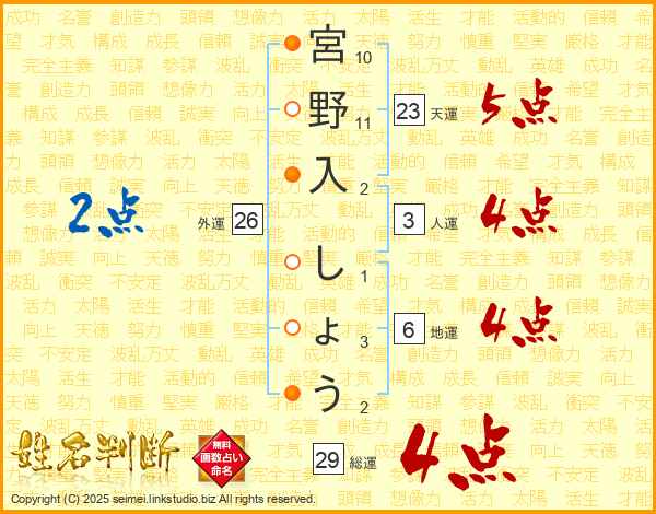 宮野入しょうさんの総運は29画の4点!