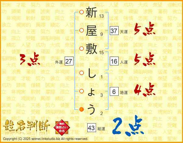新(13画)屋(9画)敷(15画) し(1画)ょ(3画)う(2画)