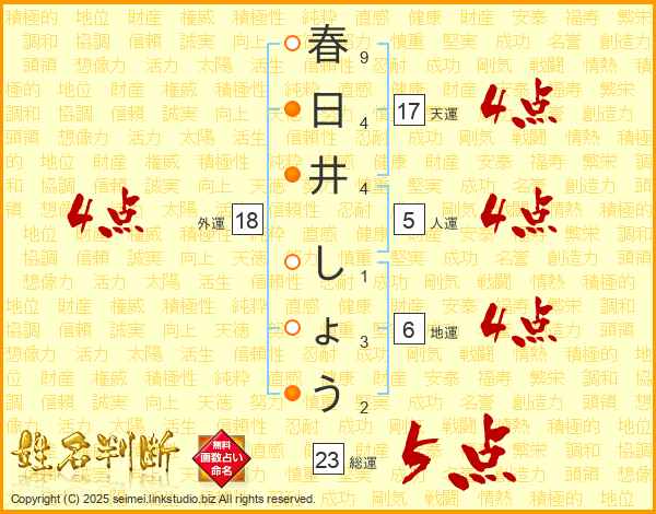 春(9画)日(4画)井(4画) し(1画)ょ(3画)う(2画)
