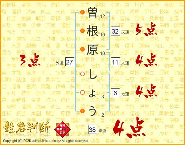 曽(12画)根(10画)原(10画) し(1画)ょ(3画)う(2画)