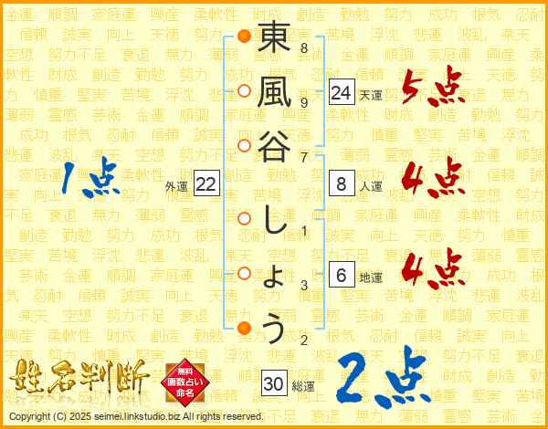 東(8画)風(9画)谷(7画) し(1画)ょ(3画)う(2画)