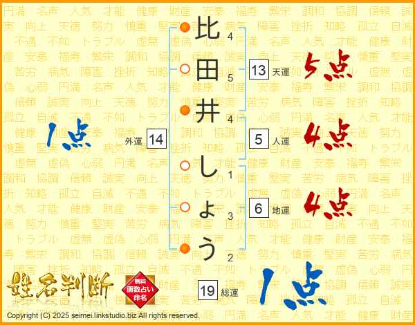 生活面を象徴する運勢です。外部から受ける影響力を表し、結婚運、家庭運や職場、環境への順応性を表します。総運から人運を引いた画数。姓や名が1文字の場合を除く。