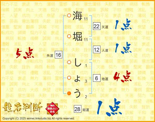 海(11画)堀(11画) し(1画)ょ(3画)う(2画)