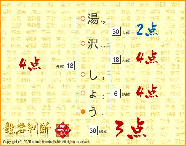 湯(13画)沢(17画) し(1画)ょ(3画)う(2画)