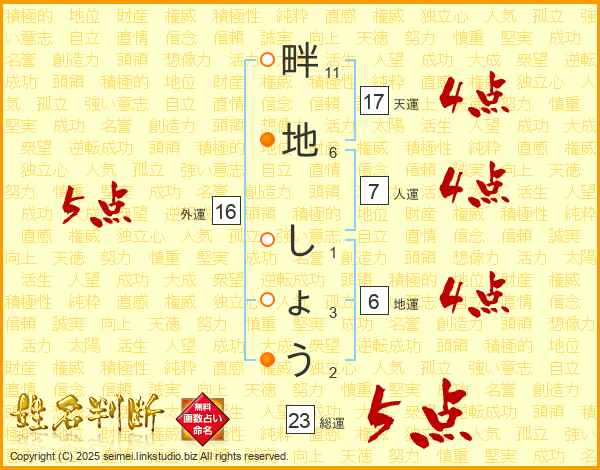 生活面を象徴する運勢です。外部から受ける影響力を表し、結婚運、家庭運や職場、環境への順応性を表します。総運から人運を引いた画数。姓や名が1文字の場合を除く。