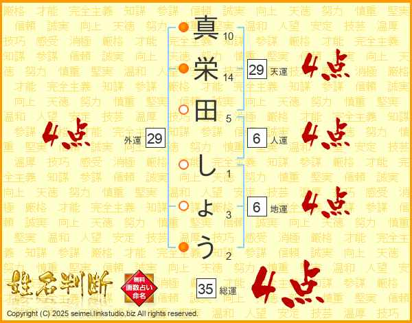 生活面を象徴する運勢です。外部から受ける影響力を表し、結婚運、家庭運や職場、環境への順応性を表します。総運から人運を引いた画数。姓や名が1文字の場合を除く。