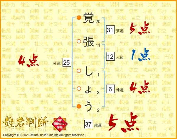 覚(20画)張(11画) し(1画)ょ(3画)う(2画)