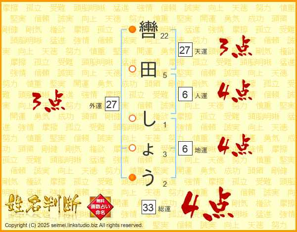 生活面を象徴する運勢です。外部から受ける影響力を表し、結婚運、家庭運や職場、環境への順応性を表します。総運から人運を引いた画数。姓や名が1文字の場合を除く。