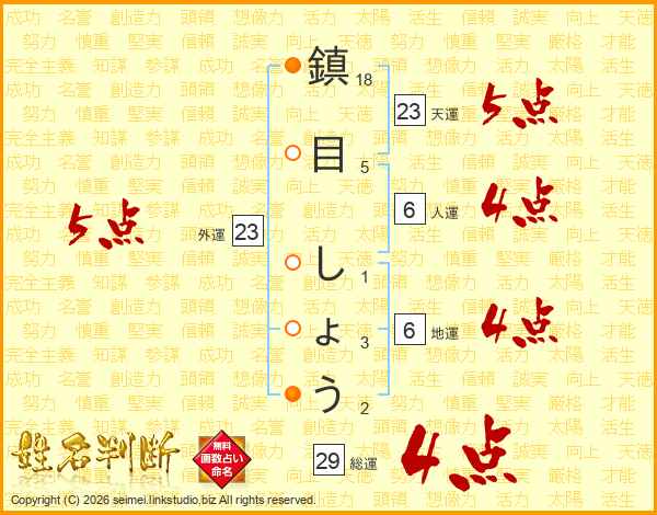 鎮(18画)目(5画) し(1画)ょ(3画)う(2画)