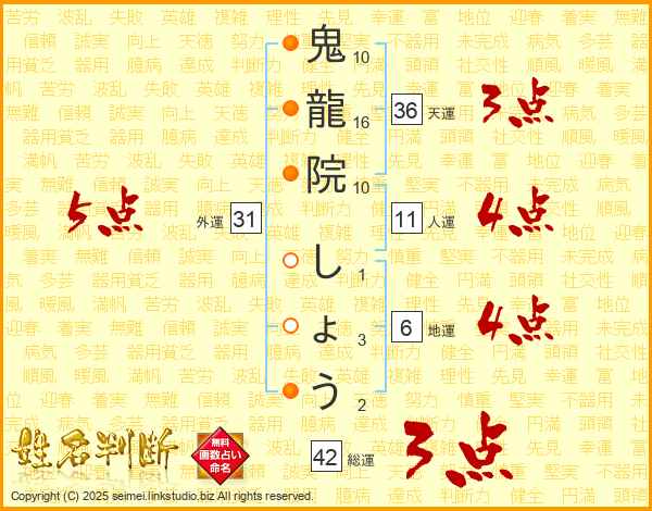 鬼(10画)龍(16画)院(10画) し(1画)ょ(3画)う(2画)