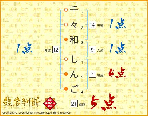 生活面を象徴する運勢です。外部から受ける影響力を表し、結婚運、家庭運や職場、環境への順応性を表します。総運から人運を引いた画数。姓や名が1文字の場合を除く。