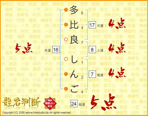 多(6画)比(4画)良(7画) し(1画)ん(2画)ご(4画)