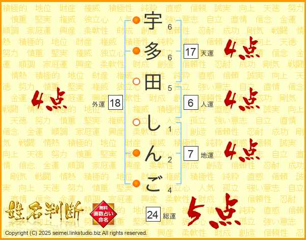 宇(6画)多(6画)田(5画) し(1画)ん(2画)ご(4画)