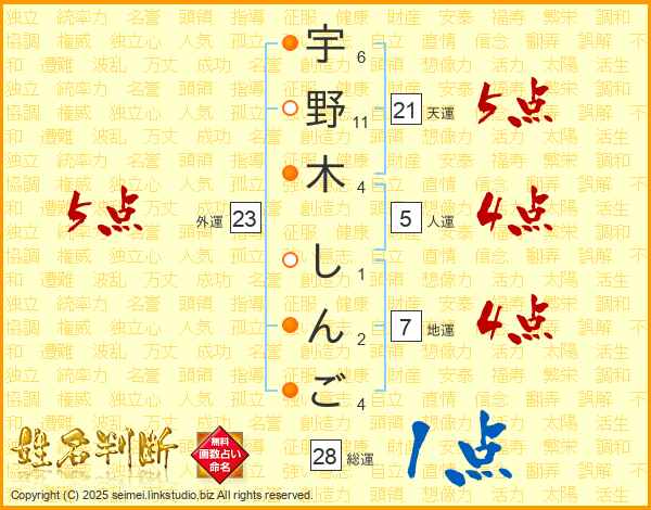 宇野木しんごさんの総運は28画の1点!
