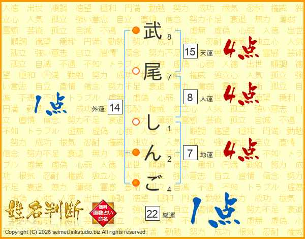 武(8画)尾(7画) し(1画)ん(2画)ご(4画)