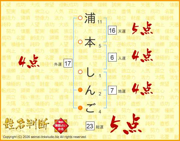 浦(11画)本(5画) し(1画)ん(2画)ご(4画)