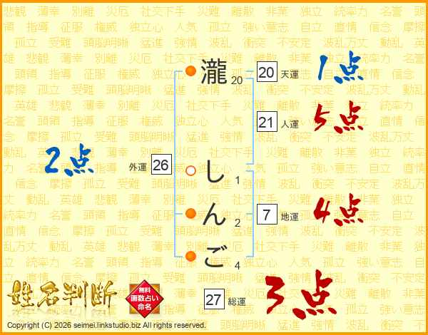 瀧(20画) し(1画)ん(2画)ご(4画)