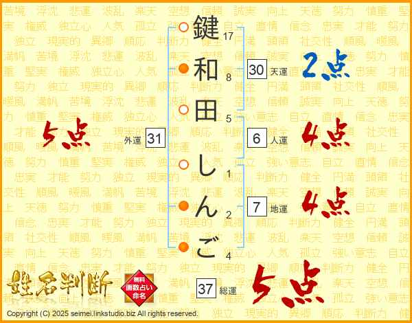 鍵(17画)和(8画)田(5画) し(1画)ん(2画)ご(4画)