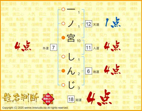 あなたの人生を表す1番重要な運勢です。生涯を通じて影響する総合運となり、主に50歳以降の晩年期に影響を及ぼします。苗字と名前の合計画数。
