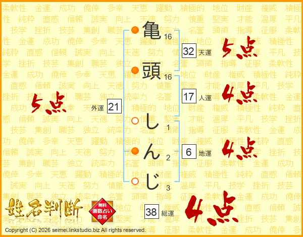 亀(16画)頭(16画) し(1画)ん(2画)じ(3画)