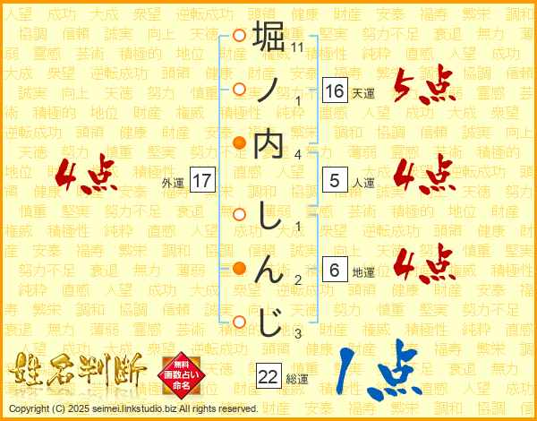 堀(11画)ノ(1画)内(4画) し(1画)ん(2画)じ(3画)