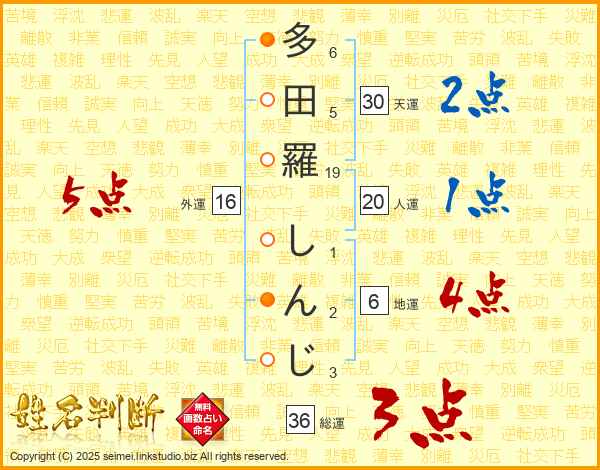 多(6画)田(5画)羅(19画) し(1画)ん(2画)じ(3画)