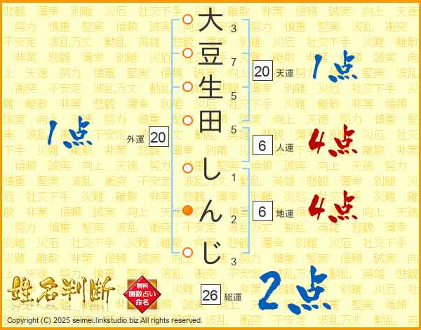 大(3画)豆(7画)生(5画)田(5画) し(1画)ん(2画)じ(3画)