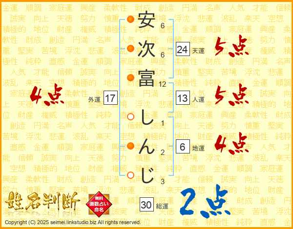 安(6画)次(6画)富(12画) し(1画)ん(2画)じ(3画)