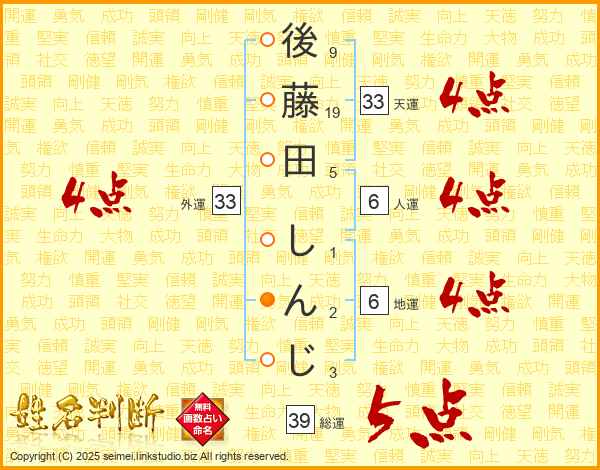 後(9画)藤(19画)田(5画) し(1画)ん(2画)じ(3画)