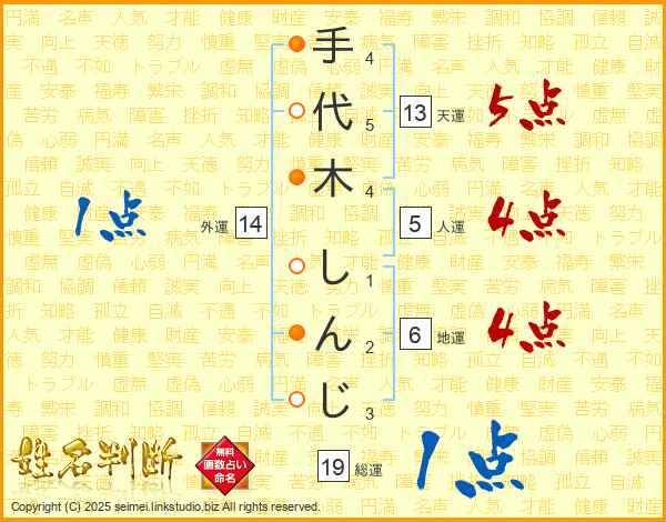 手(4画)代(5画)木(4画) し(1画)ん(2画)じ(3画)