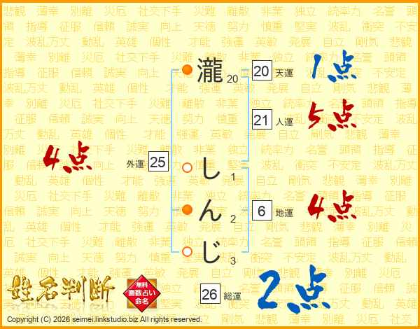 瀧(20画) し(1画)ん(2画)じ(3画)
