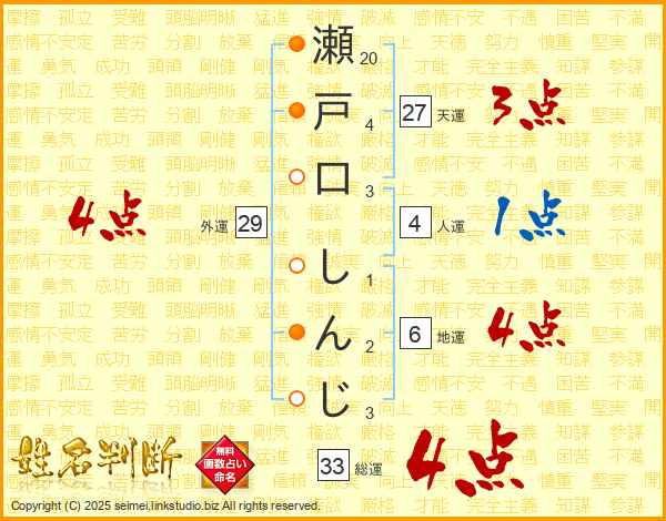 瀬(20画)戸(4画)口(3画) し(1画)ん(2画)じ(3画)