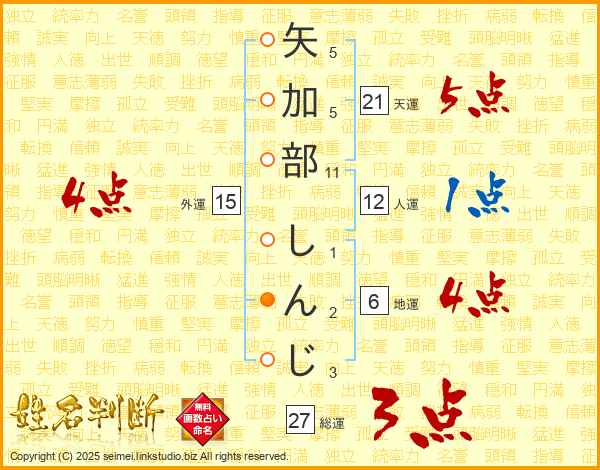 矢(5画)加(5画)部(11画) し(1画)ん(2画)じ(3画)