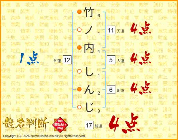 竹(6画)ノ(1画)内(4画) し(1画)ん(2画)じ(3画)