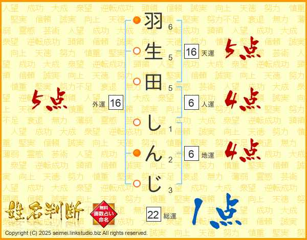 羽(6画)生(5画)田(5画) し(1画)ん(2画)じ(3画)