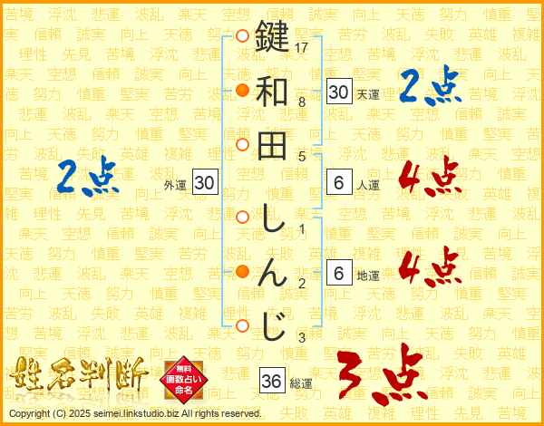 鍵(17画)和(8画)田(5画) し(1画)ん(2画)じ(3画)